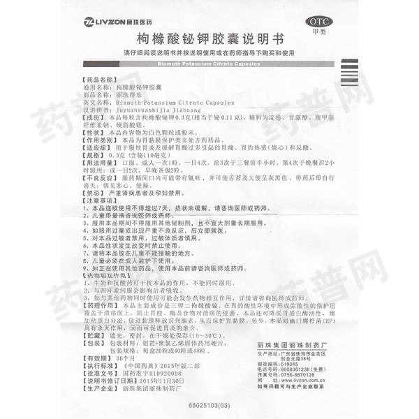 枸橼酸铋钾胶囊(丽珠得乐) 0.3g:110mg*40粒