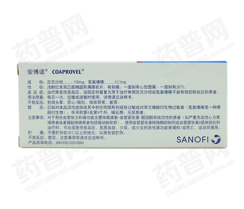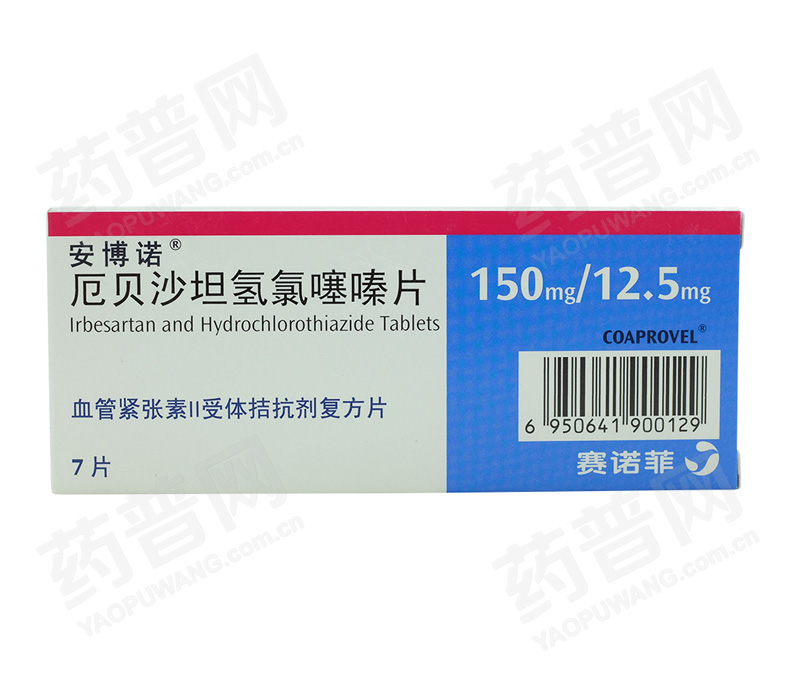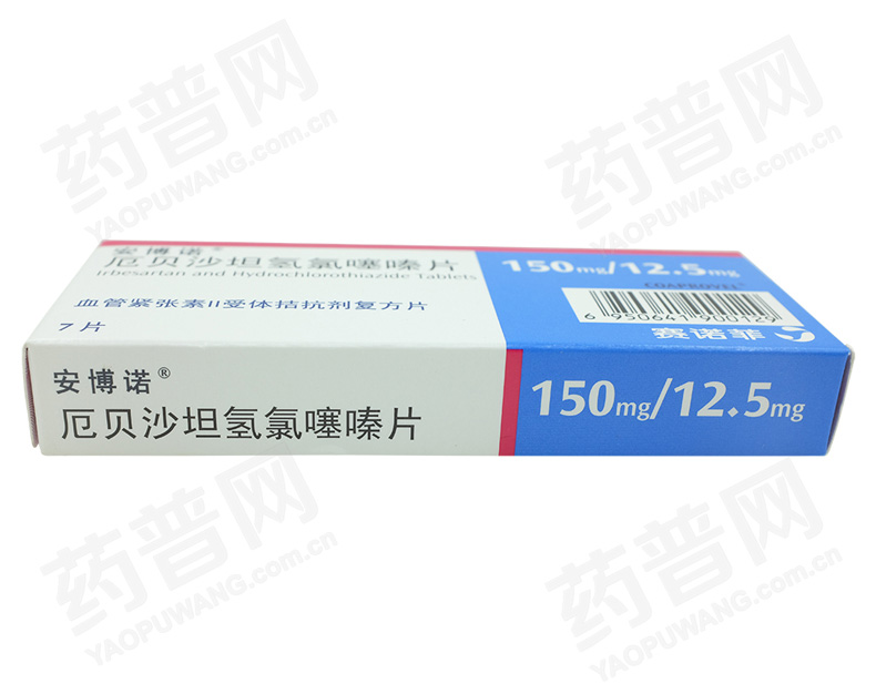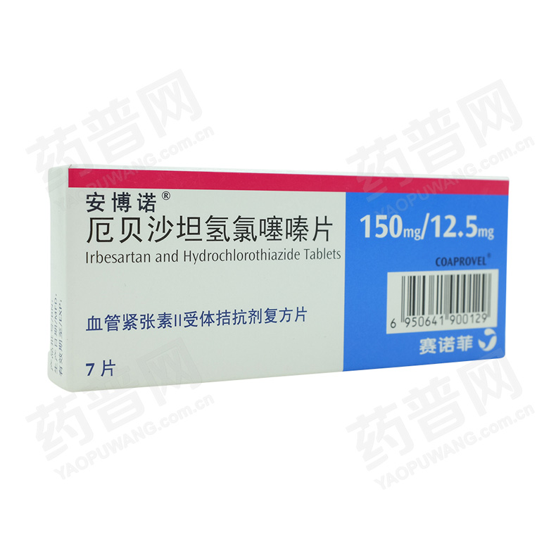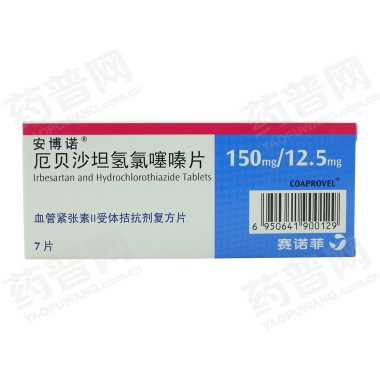 安博诺 厄贝沙坦氢氯噻嗪片 7片(150mg/12.5mg) 治疗原发性高血压,该固定剂量复方用于治疗单用厄贝沙坦或氢氯噻嗪不能有效控制血压的患者。