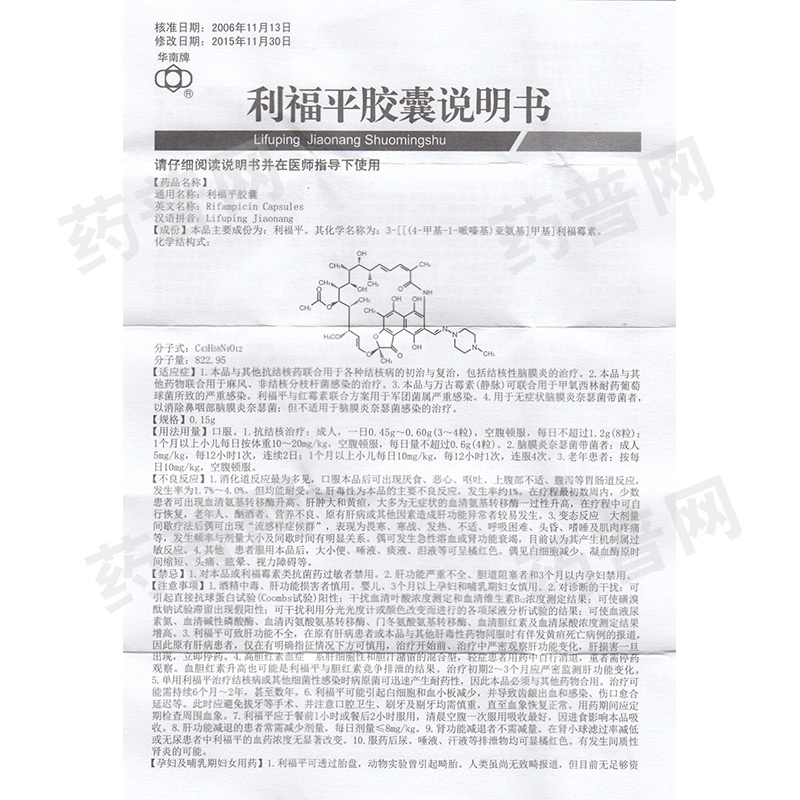 华南牌 利福平胶囊 0.15g*100粒 1.本品与其他抗结核药联合用于各种结核病的初治与复治2.本品与其他药物联合用于麻风、非结核分枝杆菌感染的治疗。3.本品与万古霉素(静脉)可联合用于甲氧西林耐药葡萄球菌所致的严重感染。利福平与红霉素联合方案用于军团菌属严重感染。4.用于无症状脑膜炎奈瑟菌带菌者