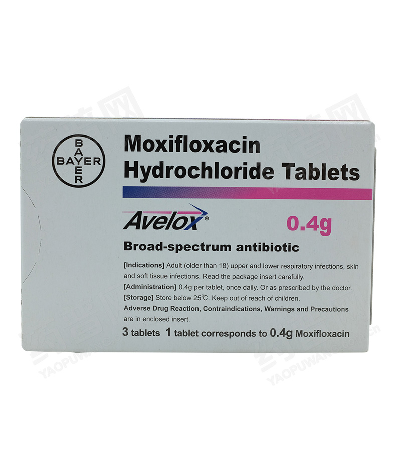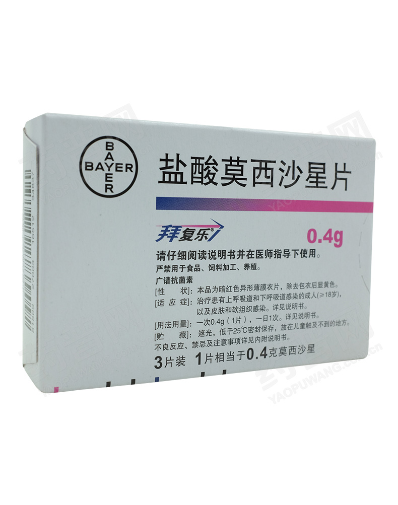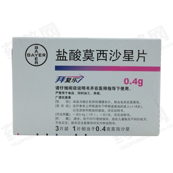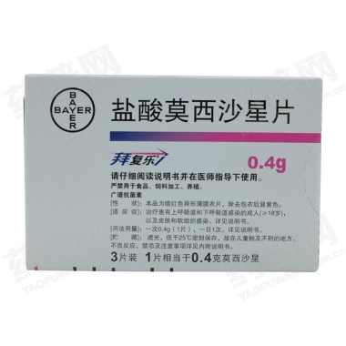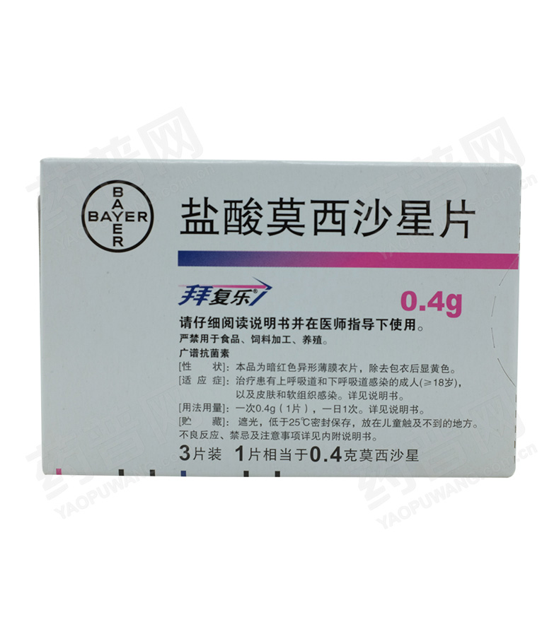 盐酸莫西沙星片(拜复乐) 0.4g*3片 本品用于治疗患有上呼吸道和下呼吸道感染的成人(≥18岁),如:急性窦炎、慢性支气管炎急性发作、社区获得性肺炎,以及皮肤和软组织感染。